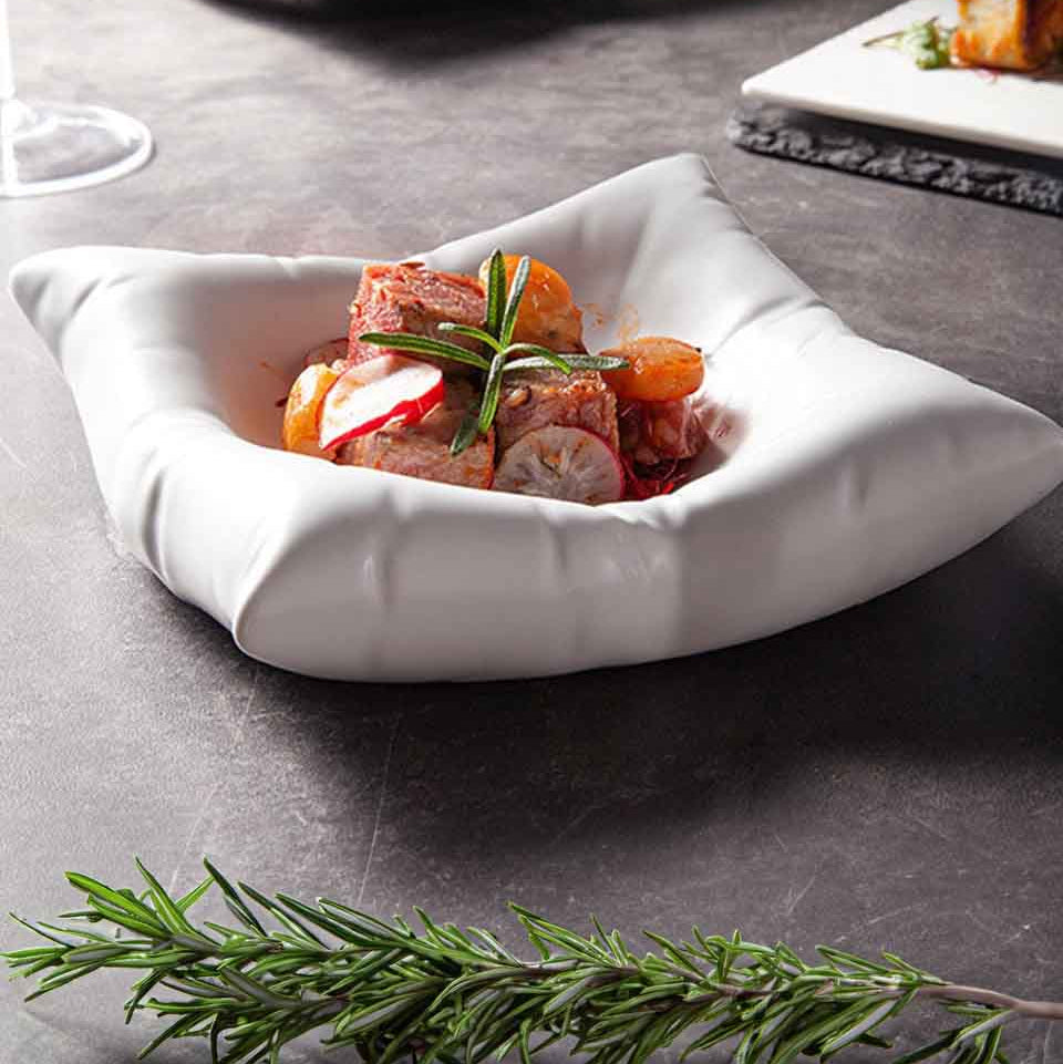 Jumeira | Ceramic Pillow Plate – Elegante Fijnkeramische Borden met Uniek Golvend Ontwerp